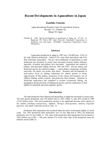 Fukusho, K. (1995). Recent developments in aquaculture in Japan. In T. U. Bagarinao & E. E. C. Flores (Eds.), Towards Sustainable Aquaculture in Southeast Asia and Japan: Proceedings of the Seminar-Workshop on Aquaculture Development in Southeast Asia, Iloilo City, Philippines, 26-28 July, 1994 (pp. 117-124). Tigbauan, Iloilo, Philippines: Aquaculture Department, Southeast Asian Fisheries Development Center.