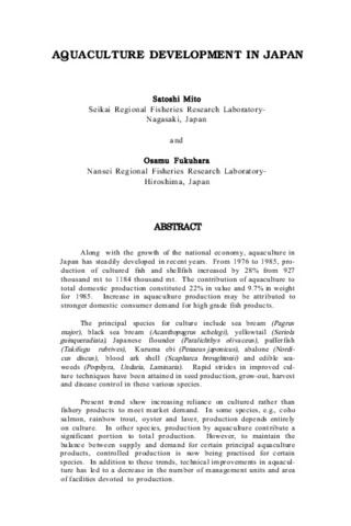 Mito, S. (1988). Aquaculture development in Japan. In J. V. Juario & L. V. Benitez (Eds.), Perspectives in Aquaculture Development in Southeast Asia and Japan: Contributions of the SEAFDEC Aquaculture Department. Proceedings of the Seminar on Aquaculture Development in Southeast Asia, 8-12 September 1987, Iloilo City, Philippines. (pp. 39-72). Tigbauan, Iloilo, Philippines: SEAFDEC, Aquaculture Department.