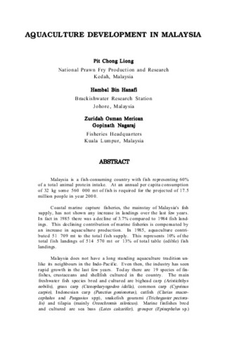 Liong, P. C., Hanafi, H. B., Merican, Z. O., Nagaraj, G. (1988). Aquaculture development in Malaysia. In J. V. Juario & L. V. Benitez (Eds.), Perspectives in Aquaculture Development in Southeast Asia and Japan: Contributions of the SEAFDEC Aquaculture Department. Proceedings of the Seminar on Aquaculture Development in Southeast Asia, 8-12 September 1987, Iloilo City, Philippines. (pp. 73-90). Tigbauan, Iloilo, Philippines: SEAFDEC, Aquaculture Department.