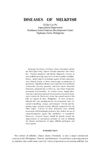 Lio-Po, G. (1984). Diseases of milkfish. In J. V. Juario, R. P. Ferraris, & L. V. Benitez (Eds.), Advances in milkfish biology and culture: Proceedings of the Second International Milkfish Aquaculture Conference, 4-8 October 1983, Iloilo City, Philippines. (pp. 147-153). Metro Manila, Philippines: Published by Island Pub. House in association with the Aquaculture Department, Southeast Asian Fisheries Development Center and the International Development Research Centre.