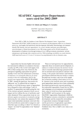 Toledo, J. D., & Castaños, M. T. (2011). SEAFDEC Aquaculture Department: score card for 2002-2009. In B. O. Acosta, R. M. Coloso, E. G. T. de Jesus-Ayson, & J. D. Toledo (Eds.), Sustainable aquaculture development for food security in Southeast Asia towards 2020. Proceedings of the Regional Technical Consultation on Sustainable Aquaculture Development in Southeast Asia Towards 2020 (pp. 135-144). Tigbauan, Iloilo, Philippines: SEAFDEC Aquaculture Department.