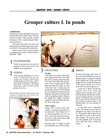 Surtida, M. B. (1999). Grouper culture. SEAFDEC Asian Aquaculture , 21(1), 22-24. http://hdl.handle.net/10862/2747