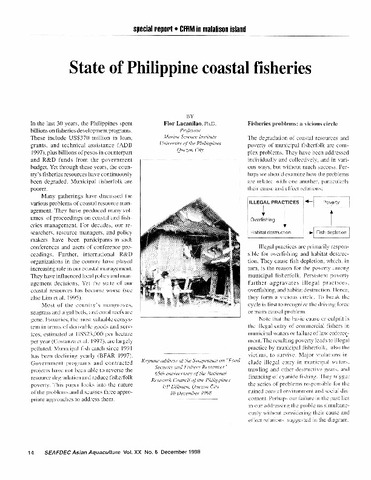 Lacanilao, F. (1998). State of Philippine coastal fisheries. SEAFDEC Asian Aquaculture , 20(6), 14-17. http://hdl.handle.net/10862/2893
