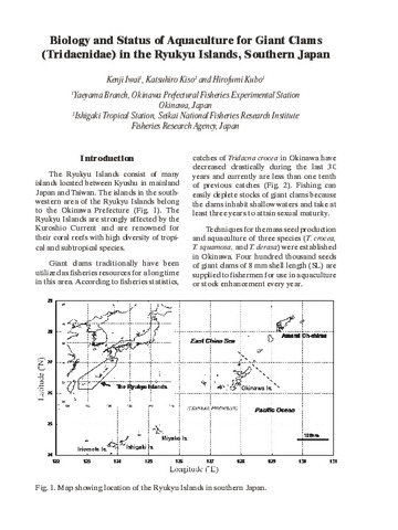 The Ryukyu Islands consist of many islands located between Kyushu in mainland Japan and Taiwan. The islands in the south-western area of the Ryukyu Islands belong to the Okinawa Prefecture. The Ryukyu Islands are strongly affected by the Kuroshio Current and are renowned for their coral reefs with high diversity of tropical and subtropical species. Giant clams traditionally have been utilized as fisheries resources for a long time in this area. According to fisheries statistics, catches of Tridacna crocea in Okinawa have decreased drastically during the last 30 years and currently are less than one tenth of previous catches. Fishing can easily deplete stocks of giant clams because the clams inhabit shallow waters and take at least three years to attain sexual maturity. Techniques for the mass seed production and aquaculture of three species (T. crocea, T. squamosa, and T. derasa) were established in Okinawa. Four hundred thousand seeds of giant clams of 8 mm shell length (SL) are supplied to fishermen for use in aquaculture or stock enhancement every year. This paper will review the (1) biology of giant clams, (2) present status of aquaculture of giant clams in Okinawa, and (3) other studies on giant clams in southern Japan.