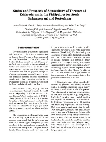 Status and prospects of aquaculture of threatened echinoderms in the Philippines for stock enhancement and restocking