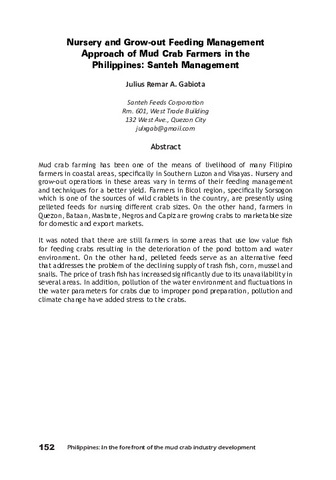 Mud crab (Scylla serrata) farming has been one of the means of livelihood of many Filipino farmers in coastal areas, specifically in Southern Luzon and Visayas. Nursery and grow-out operations in these areas vary in terms of their feeding management and techniques for a better yield. Farmers in Bicol region, specifically Sorsogon which is one of the sources of wild crablets in the country, are presently using pelleted feeds for nursing different crab sizes. On the other hand, farmers in Quezon, Bataan, Masbate, Negros and Capiz are growing crabs to marketable size for domestic and export markets.
