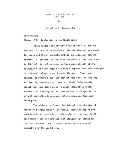 Tumanda, Jr., M. I. (1974). Sugpo fry production at MSU-IFRD. Paper presented at the First Seminar of the Fishpond Cooperators' Program on Prawn Culture in Mindanao Held on November 25-29, 1974 in Naawan, Misamis Oriental.