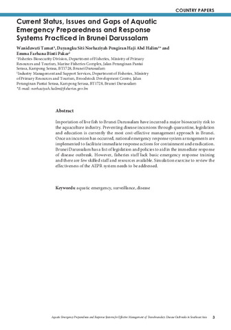 Tamat, W., Halim, D. S. N. P. H. A., & Pakar, E. F. B. (2019). Current status, issues and gaps of aquatic emergency preparedness and response systems practiced in Brunei Darussalam. In E. A. Tendencia, L. D. de la Peña, & J. M. V. de la Cruz (Eds.), Aquatic Emergency Preparedness and Response Systems for Effective Management of Transboundary Disease Outbreaks in Southeast Asia: Proceedings of Asean Regional Technical Consultation, 20-22 August 2018, Centara Grand Central Ladprao, Bangkok, Thailand (pp. 3-6). Tigbauan, Iloilo, Philippines: Aquaculture Department, Southeast Asian Fisheries Development Center.
