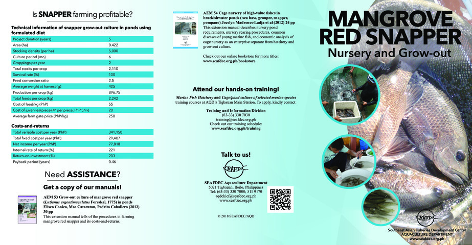 SEAFDEC Aquaculture Department. (2018). Mangrove red snapper nursery and grow-out [Brochure]. Tigbauan, Iloilo, Philippines: Author.