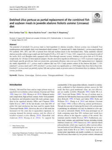 Santizo-Taan, R., Bautista-Teruel, M., & Maquirang, J. R. H. (2020). Enriched Ulva pertusa as partial replacement of the combined fish and soybean meals in juvenile abalone Haliotis asinina (Linnaeus) diet. Journal of Applied Phycology , 32(1), 741-749. https://doi.org/10.1007/s10811-019-01977-5