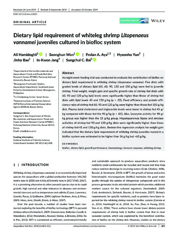 Hamidoghli, A., Won, S., Aya, F., Yun, H., Bae, J., Jang, I.-K., & Bai, S. C. (2020). Dietary lipid requirement of whiteleg shrimp Litopenaeus vannamei juveniles cultured in biofloc system. Aquaculture Nutrition , 26(3), 603-612. https://doi.org/10.1111/anu.13021