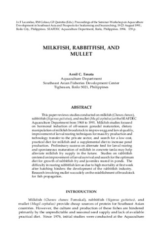 Emata, A. C. (1994). Milkfish, rabbitfish and mullet. In F. Lacanilao, R. M. Coloso, & G. F. Quinitio (Eds.), Proceedings of the Seminar-Workshop on Aquaculture Development in Southeast Asia and Prospects for Seafarming and Searanching; 19-23 August 1991; Iloilo City, Philippines. (pp. 13-23.). Tigbauan, Iloilo, Philippines: Aquaculture Department, Southeast Asian Fisheries Development Center.