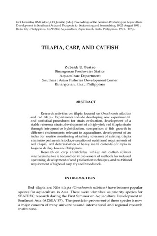 Basiao, Z. U. (1994). Tilapia, carp and catfish. In F. Lacanilao, R. M. Coloso, & G. F. Quinitio (Eds.), Proceedings of the Seminar-Workshop on Aquaculture Development in Southeast Asia and Prospects for Seafarming and Searanching; 19-23 August 1991; Iloilo City, Philippines. (pp. 24-31). Tigbauan, Iloilo, Philippines: Aquaculture Department, Southeast Asian Fisheries Development Center.