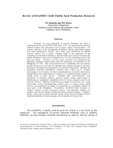 Quinitio, G. F., Duray, M. N. (1996). Review of SEAFDEC/AQD finfish seed production research. In C. L. Marte, G. F. Quinitio, & A. C. Emata (Eds.), Proceedings of the Seminar-Workshop on Breeding and Seed Production of Cultured Finfishes in the Philippines, Tigbauan, Iloilo, Philippines, 4-5 May 1993 (pp. 119-131). Tigbauan, Iloilo, Philippines: Aquaculture Department, Southeast Asian Fisheries Development Center.