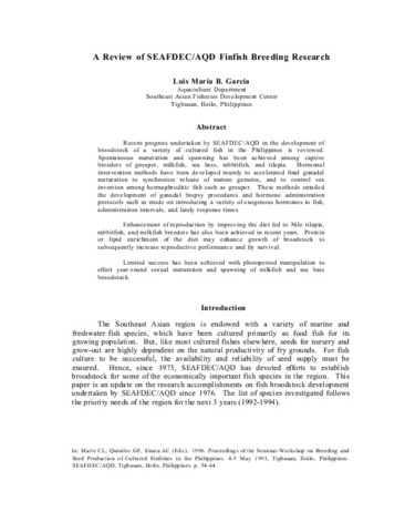 Recent progress undertaken by SEAFDEC/AQD in the development of broodstock of a variety of cultured fish in the Philippines is reviewed. Spontaneous maturation and spawning has been achieved among captive breeders of grouper, milkfish, sea bass, rabbitfish, and tilapia. Hormonal intervention methods have been developed mainly to accelerated final gonadal maturation to synchronize release of mature gametes, and to control sex inversion among hermaphroditic fish such as grouper. These methods entailed the development of gonadal biopsy procedures and hormone administration protocols such as mode on introducing a variety of exogenous hormones to fish, administration intervals, and lately response times.Enhancement of reproduction by improving the diet fed to Nile tilapia, rabbitfish, and milkfish breeders has also been achieved in recent years. Protein or lipid enrichment of the diet may enhance growth of broodstock to subsequently increase reproductive performance and fry survival.Limited success has been achieved with photoperiod manipulation to effect year-round sexual maturation and spawning of milkfish and sea bass broodstock.