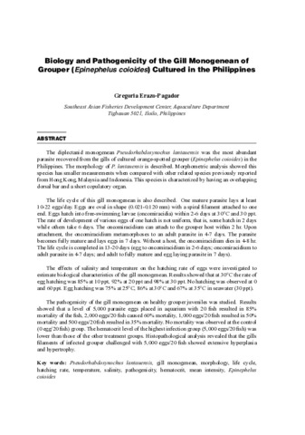 Biology and pathogenicity of the gill monogenean of grouper (Epinephelus coioides) cultured in the Philippines
