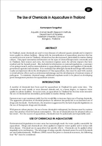 In Thailand, many chemicals are used to treat diseases of cultured aquatic animals and to improve water quality in culture facilities. Along with the intensification of aquaculture practices that has occurred in recent years in Thailand, chemical use has also increased, particularly in marine shrimp culture. This paper summarizes information on the types of chemotherapeutants commonly used in Thailand, their sources and costs, the treatment regimes used, the adverse impacts that have resulted and the hazards posed. Also included is information on national regulations, a summary of on-going research, and recommendations to aquaculturists, producers and suppliers of chemicals, government agencies and scientists. It is concluded that although chemicals and drugs will continue to play an important role in the development of Thai aquaculture, they must be used with caution to avoid adverse effects such as environmental damage and the development of resistant strains of pathogens. To minimize chemical usage, additional emphasis needs to be placed on developing good management practices for aquaculture systems.