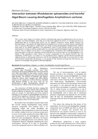 Cabalfin, J. J. M. C., Lamzon, J. D. H., Serra, V. R. M., Mediodia, H. P., & Catedral, D. D. (2019). Interaction between Rhodobacter sphaeroides and Harmful Algal Bloom (HAB) causing dinoflagellate Amphidinium carterae. Publiscience , 2(1), 159-164. http://hdl.handle.net/10862/5999