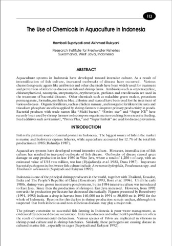Supriyadi, H., & Rukyani, A. (2000). The use of chemicals in aquaculture in Indonesia. In J. R. Arthur, C. R. Lavilla-Pitogo, & R. P. Subasinghe (Eds.), Use of Chemicals in Aquaculture in Asia: Proceedings of the Meeting on the Use of Chemicals in Aquaculture in Asia, 20-22 May 1996, Tigbauan, Iloilo, Philippines (pp. 113-118). Tigbauan, Iloilo, Philippines: Aquaculture Department, Southeast Asian Fisheries Development Center.