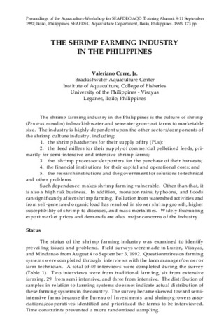 Corre Jr., V. (1993). The shrimp farming industry in the Philippines. In C.T. Villegas, M.T. Castaños, & R.B. Lacierda (Eds.) Proceedings of the Aquaculture Workshop for SEAFDEC/AQD Training Alumni, 8-11 September 1992, Iloilo, Philippines (pp. 88-103). Tigbauan, Iloilo, Philippines: Aquaculture Department, Southeast Asian Fisheries Development Center.