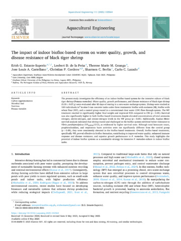 Estante-Superio, E., de la Peña, L. D., Geanga, T. M. M., Castellano, J. L. A., Cordero, C. P., Berlin, S. C., & Lazado, C. C. (2025). The impact of indoor biofloc-based system on water quality, growth, and disease resistance of black tiger shrimp. Aquacultural Engineering , 111, 102564. https://doi.org/10.1016/j.aquaeng.2025.102564