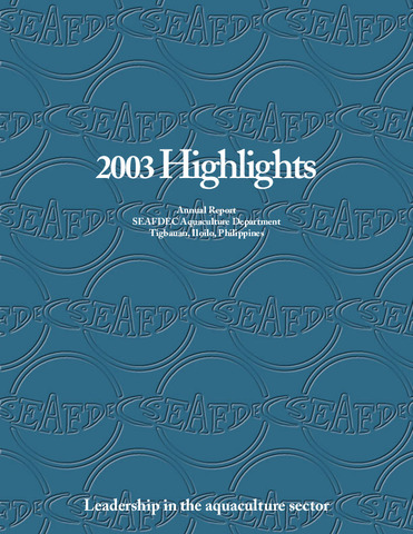 SEAFDEC/AQD. (2004). 2003 Highlights. Tigbauan, Iloilo, Philippines: Aquaculture Department, Southeast Asian Fisheries Development Center.