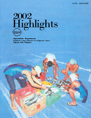 SEAFDEC/AQD. (2003). 2002 highlights. Tigbauan, Iloilo, Philippines: Aquaculture Department, Southeast Asian Fisheries Development Center.