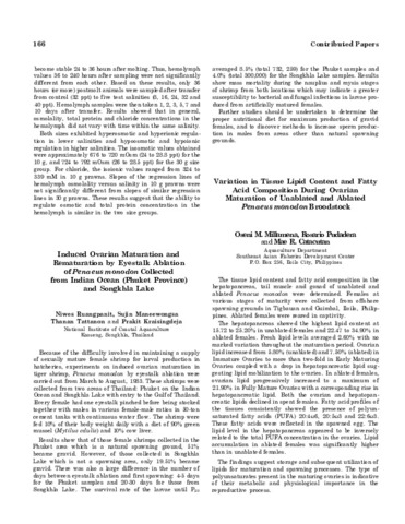 The tissue lipid content and fatty acid composition in the hepatopancreas, tail muscle and gonad of unablated and ablated Penaeus monodon were determined. Females at various stages of maturity were collected from offshore spawning grounds in Tigbauan and Guimbal, Iloilo, Philippines. Ablated females were reared in captivity.