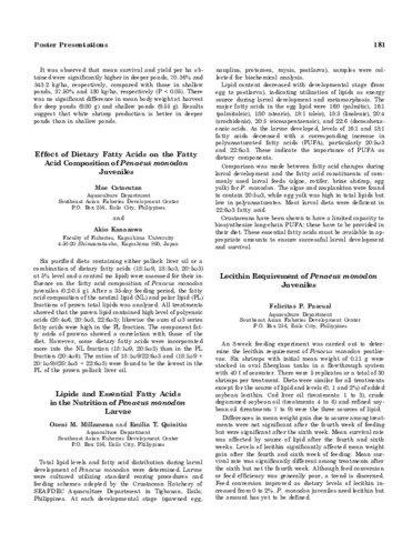 Millamena, O. M., & Quinitio, E. T. (1985). Lipids and essential fatty acids in the nutrition of Penaeus monodon larvae. (Abstract only). In Taki Y., Primavera J.H. and Llobrera J.A. (Eds.). Proceedings of the First International Conference on the Culture of Penaeid Prawns/Shrimps, 4-7 December 1984, Iloilo City, Philippines (p. 181). Iloilo City, Philippines: Aquaculture Department, Southeast Asian Fisheries Development Center.